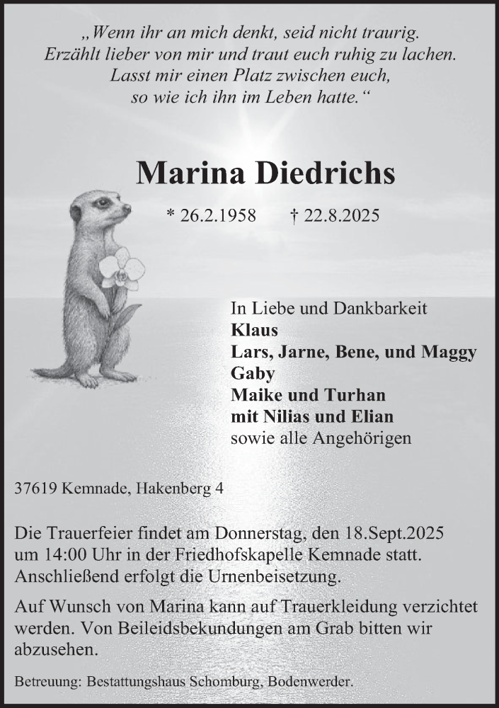 Hier finden Sie alle Traueranzeigen aus der Zeitung, die bisher für Marina Diedrichs erschienen sind. Weitere Traueranzeigen, die in der Zeitung erscheinen, werden hier ebenfalls aufgelistet