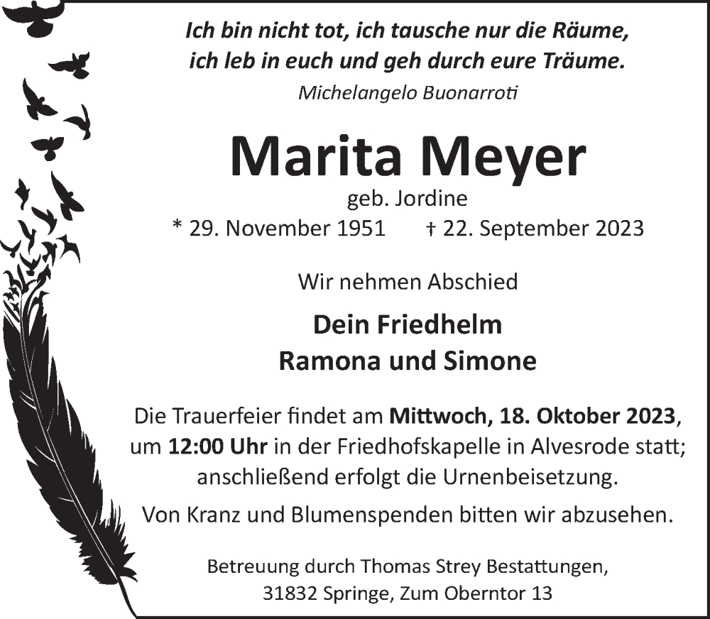 Hier finden Sie alle Traueranzeigen aus der Zeitung, die bisher für Marita Meyer erschienen sind. Weitere Traueranzeigen, die in der Zeitung erscheinen, werden hier ebenfalls aufgelistet