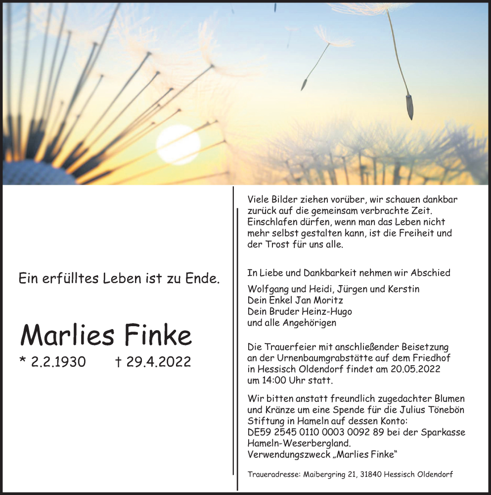 Hier finden Sie alle Traueranzeigen aus der Zeitung, die bisher für Marlies Finke erschienen sind. Weitere Traueranzeigen, die in der Zeitung erscheinen, werden hier ebenfalls aufgelistet