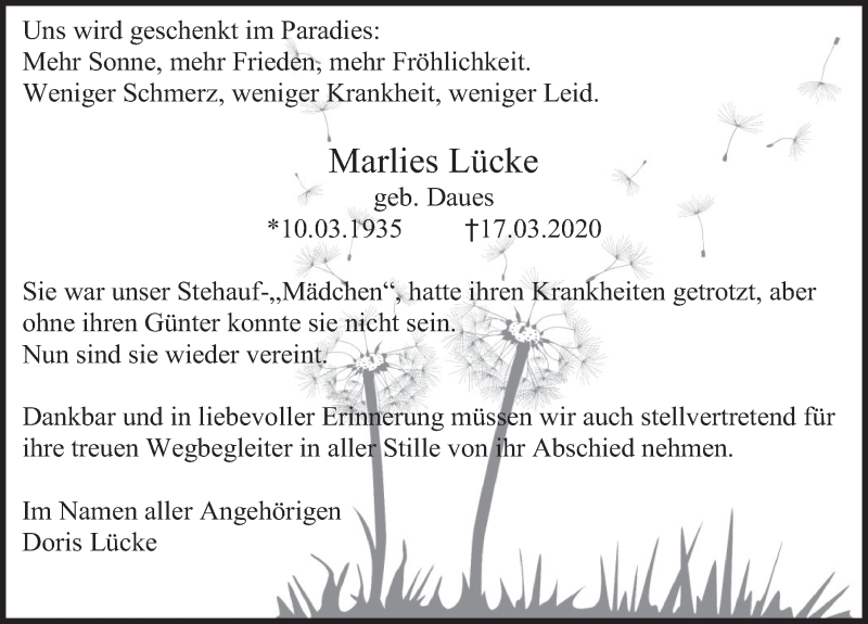 Hier finden Sie alle Traueranzeigen aus der Zeitung, die bisher für Marlies Lücke erschienen sind. Weitere Traueranzeigen, die in der Zeitung erscheinen, werden hier ebenfalls aufgelistet