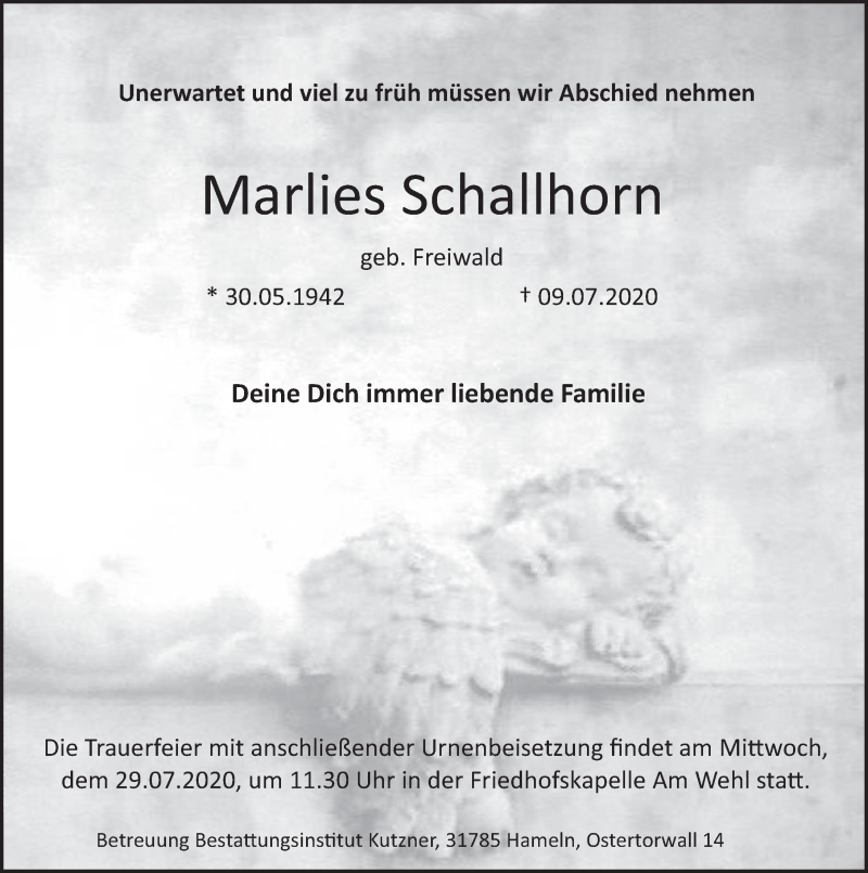 Hier finden Sie alle Traueranzeigen aus der Zeitung, die bisher für Marlies Schallhorn erschienen sind. Weitere Traueranzeigen, die in der Zeitung erscheinen, werden hier ebenfalls aufgelistet