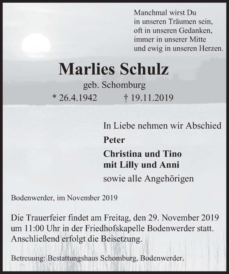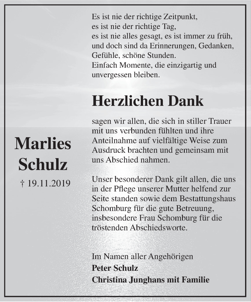 Hier finden Sie alle Traueranzeigen aus der Zeitung, die bisher für Marlies Schulz erschienen sind. Weitere Traueranzeigen, die in der Zeitung erscheinen, werden hier ebenfalls aufgelistet