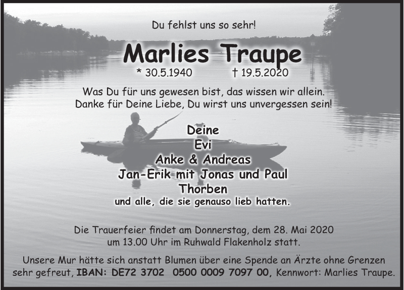 Hier finden Sie alle Traueranzeigen aus der Zeitung, die bisher für Marlies Traupe erschienen sind. Weitere Traueranzeigen, die in der Zeitung erscheinen, werden hier ebenfalls aufgelistet