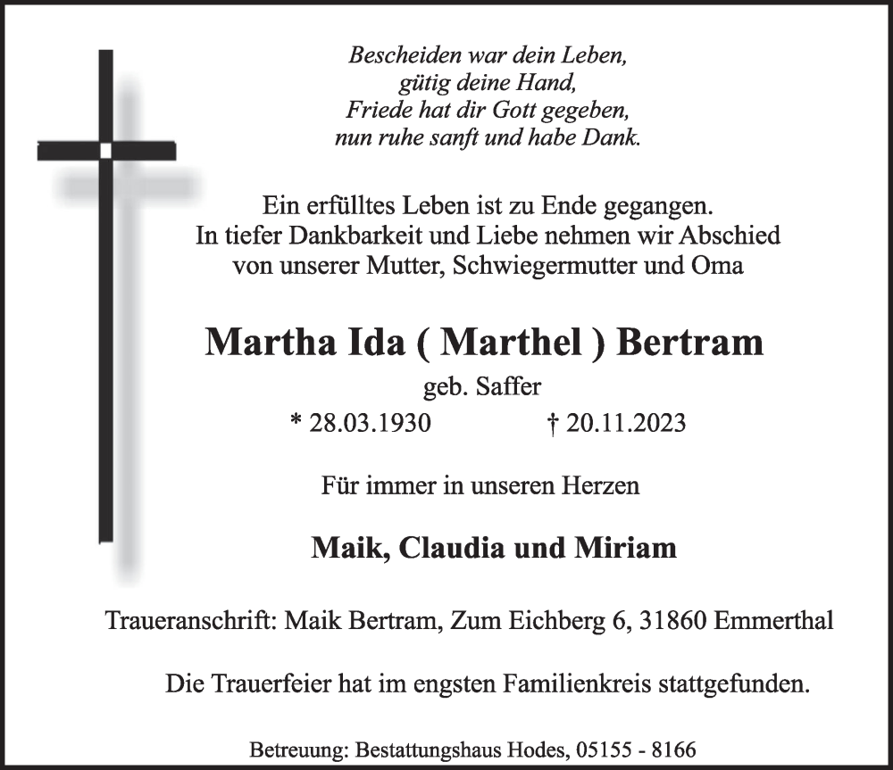 Hier finden Sie alle Traueranzeigen aus der Zeitung, die bisher für Martha Ida Bertram erschienen sind. Weitere Traueranzeigen, die in der Zeitung erscheinen, werden hier ebenfalls aufgelistet