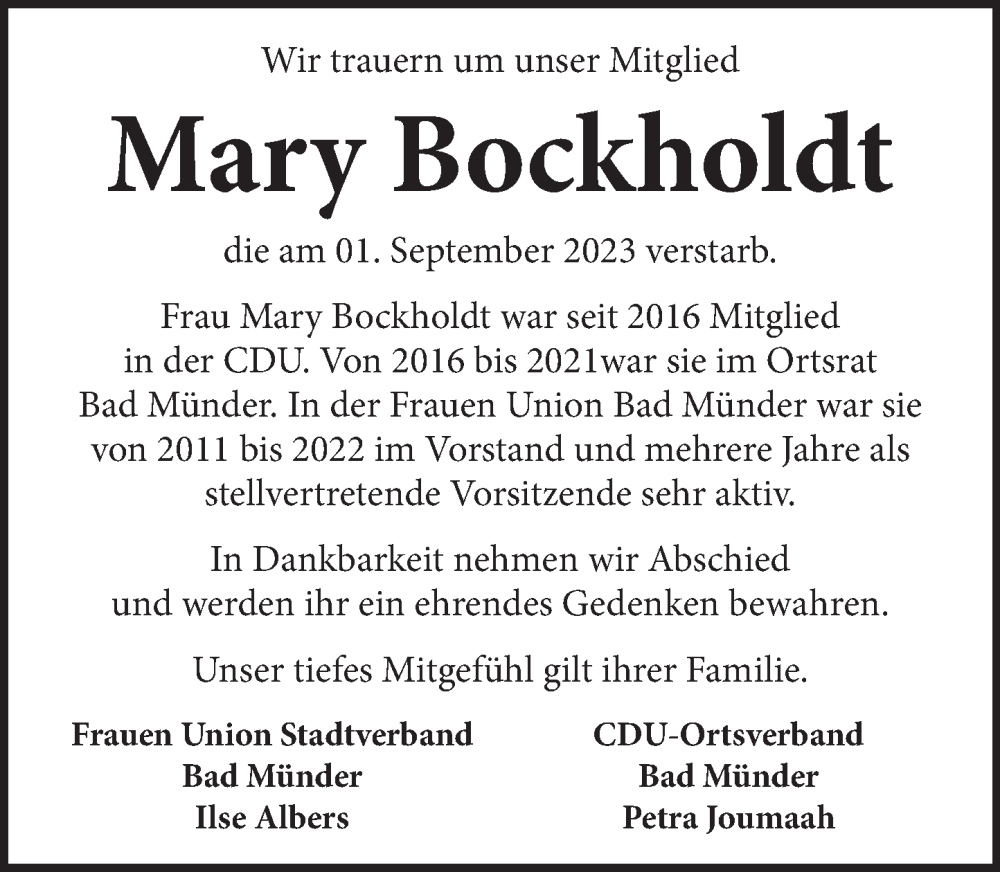 Hier finden Sie alle Traueranzeigen aus der Zeitung, die bisher für Mary Bockholdt erschienen sind. Weitere Traueranzeigen, die in der Zeitung erscheinen, werden hier ebenfalls aufgelistet