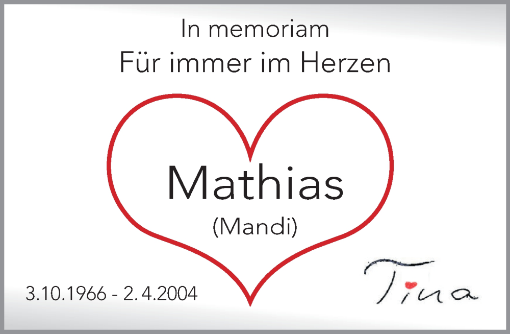 Hier finden Sie alle Traueranzeigen aus der Zeitung, die bisher für Mathias erschienen sind. Weitere Traueranzeigen, die in der Zeitung erscheinen, werden hier ebenfalls aufgelistet
