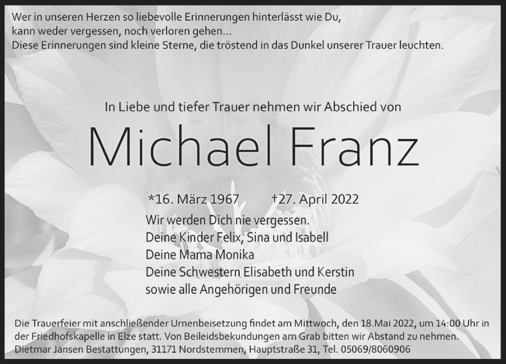 Hier finden Sie alle Traueranzeigen aus der Zeitung, die bisher für Michael Franz erschienen sind. Weitere Traueranzeigen, die in der Zeitung erscheinen, werden hier ebenfalls aufgelistet