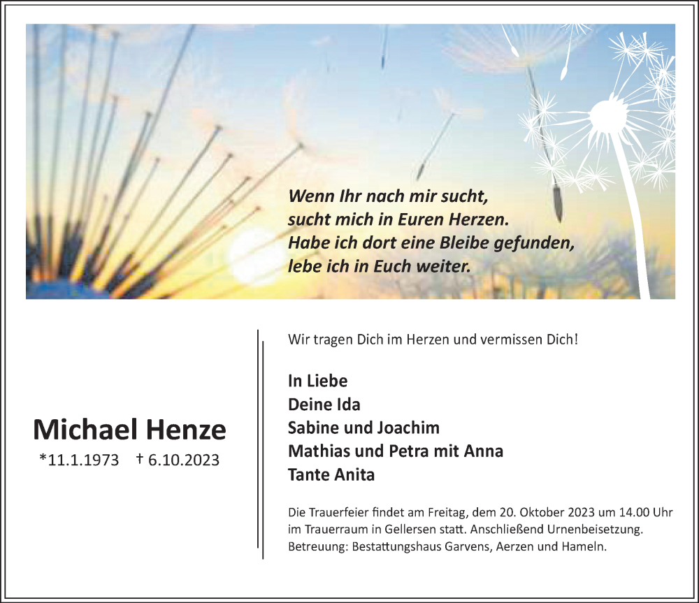 Hier finden Sie alle Traueranzeigen aus der Zeitung, die bisher für Michael Henze erschienen sind. Weitere Traueranzeigen, die in der Zeitung erscheinen, werden hier ebenfalls aufgelistet