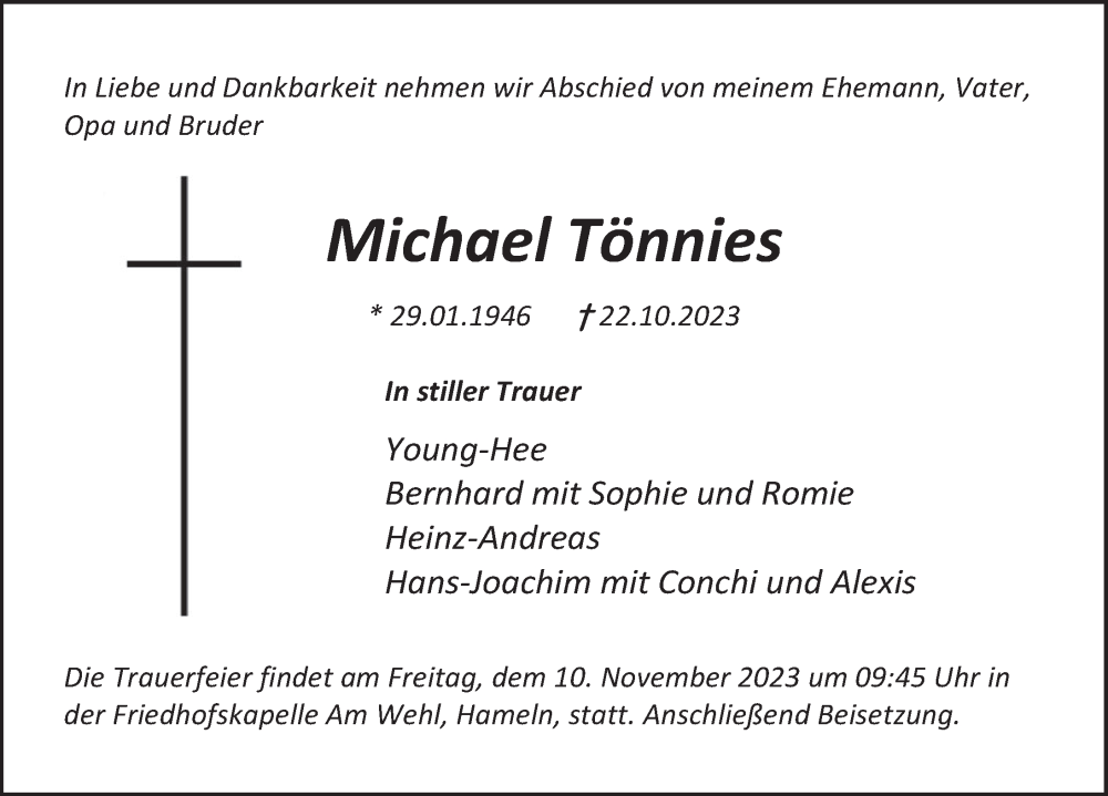 Hier finden Sie alle Traueranzeigen aus der Zeitung, die bisher für Michael Tönnies erschienen sind. Weitere Traueranzeigen, die in der Zeitung erscheinen, werden hier ebenfalls aufgelistet