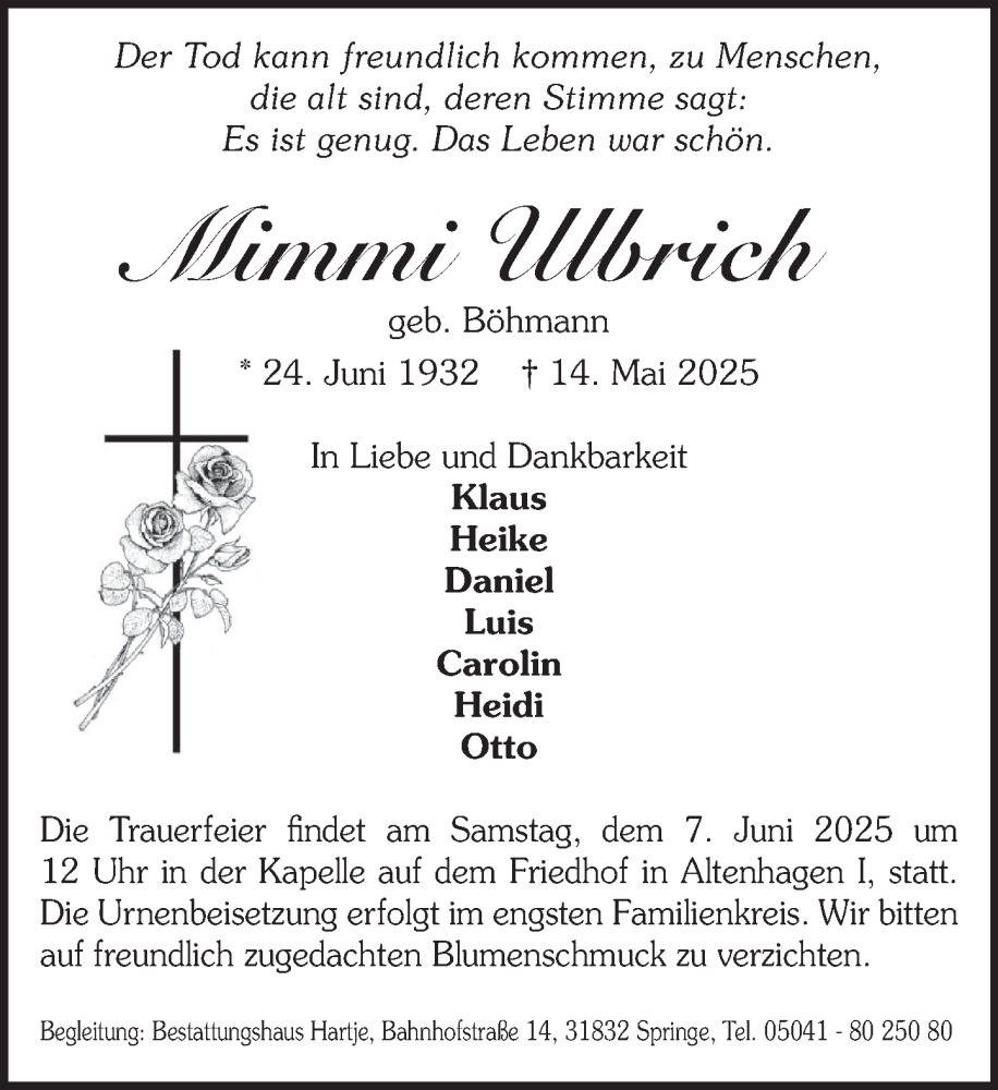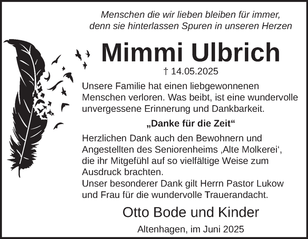 Hier finden Sie alle Traueranzeigen aus der Zeitung, die bisher für Mimmi Ulbrich erschienen sind. Weitere Traueranzeigen, die in der Zeitung erscheinen, werden hier ebenfalls aufgelistet
