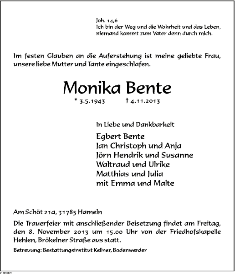 Hier finden Sie alle Traueranzeigen aus der Zeitung, die bisher für Monika Bente erschienen sind. Weitere Traueranzeigen, die in der Zeitung erscheinen, werden hier ebenfalls aufgelistet