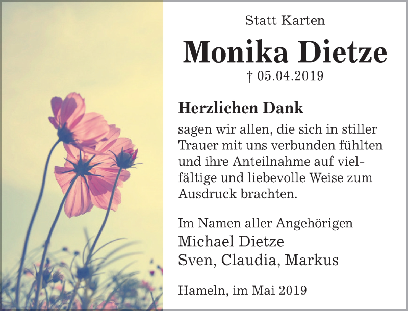 Hier finden Sie alle Traueranzeigen aus der Zeitung, die bisher für Monika Dietze erschienen sind. Weitere Traueranzeigen, die in der Zeitung erscheinen, werden hier ebenfalls aufgelistet