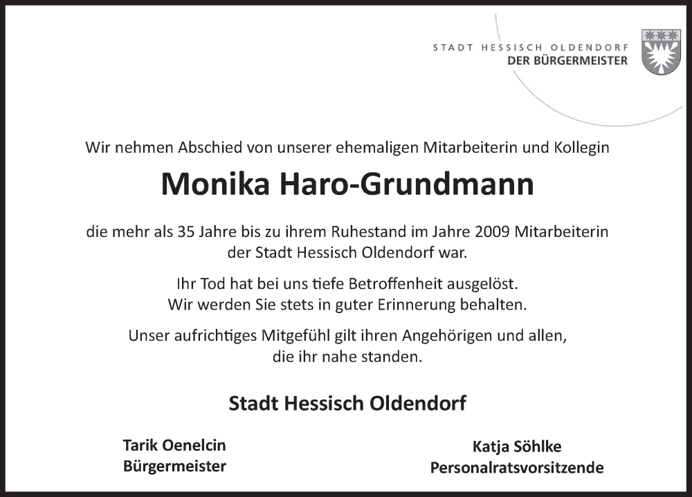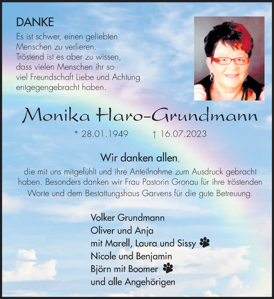 Hier finden Sie alle Traueranzeigen aus der Zeitung, die bisher für Monika Haro-Grundmann erschienen sind. Weitere Traueranzeigen, die in der Zeitung erscheinen, werden hier ebenfalls aufgelistet