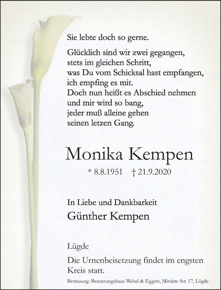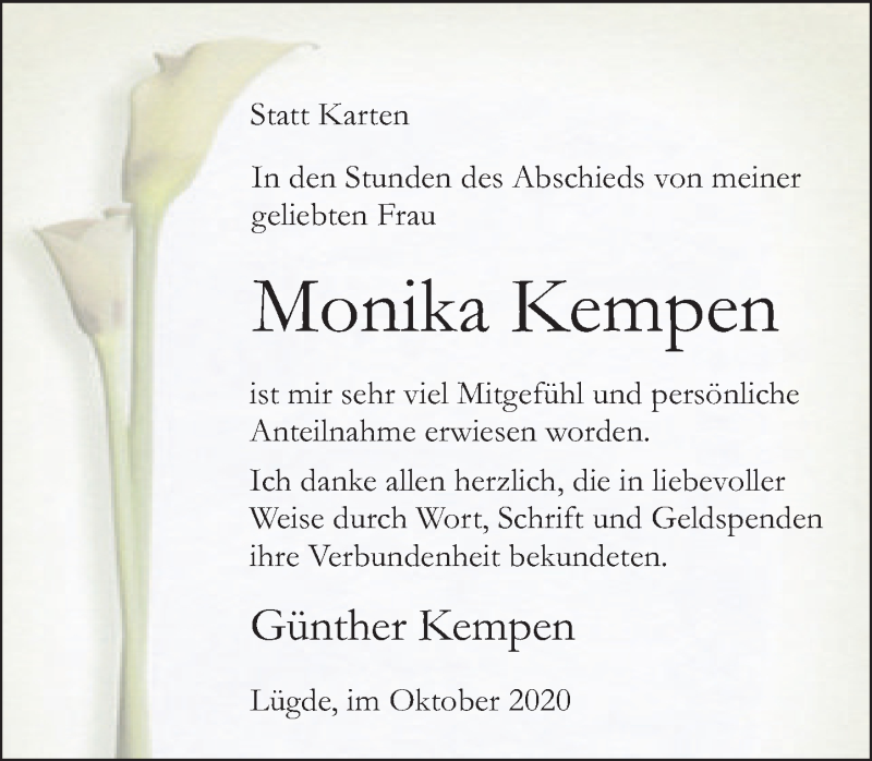 Hier finden Sie alle Traueranzeigen aus der Zeitung, die bisher für Monika Kempen erschienen sind. Weitere Traueranzeigen, die in der Zeitung erscheinen, werden hier ebenfalls aufgelistet