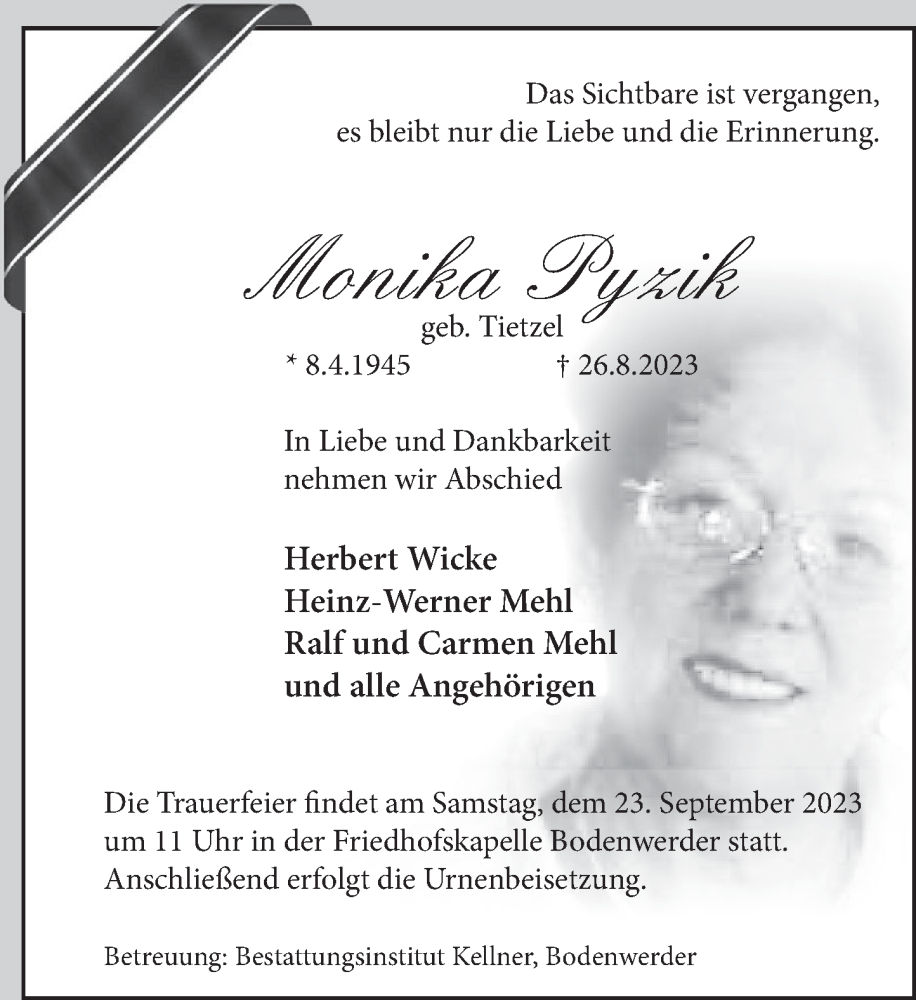 Hier finden Sie alle Traueranzeigen aus der Zeitung, die bisher für Monika Pyzik erschienen sind. Weitere Traueranzeigen, die in der Zeitung erscheinen, werden hier ebenfalls aufgelistet