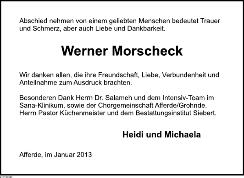 Hier finden Sie alle Traueranzeigen aus der Zeitung, die bisher für Morscheck erschienen sind. Weitere Traueranzeigen, die in der Zeitung erscheinen, werden hier ebenfalls aufgelistet