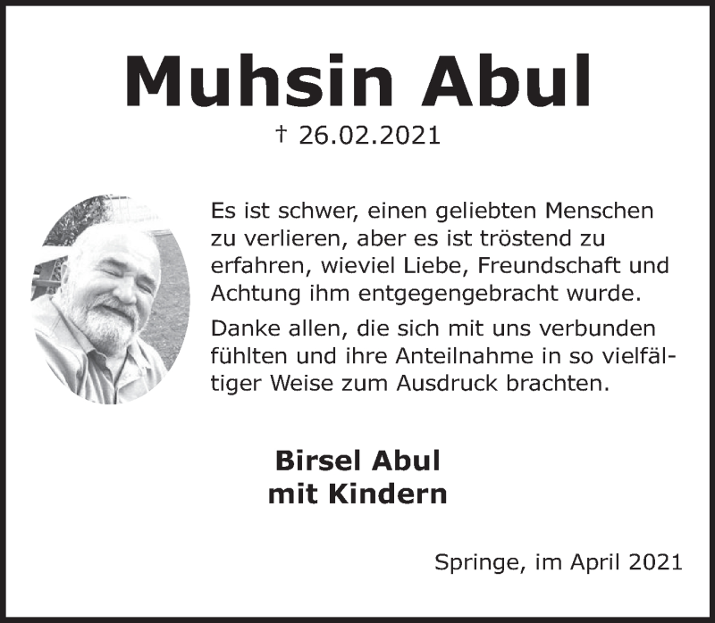 Hier finden Sie alle Traueranzeigen aus der Zeitung, die bisher für Muhsin Abul erschienen sind. Weitere Traueranzeigen, die in der Zeitung erscheinen, werden hier ebenfalls aufgelistet