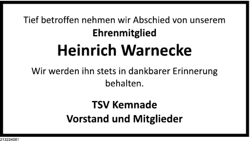 Hier finden Sie alle Traueranzeigen aus der Zeitung, die bisher für Nachruf Warnecke erschienen sind. Weitere Traueranzeigen, die in der Zeitung erscheinen, werden hier ebenfalls aufgelistet