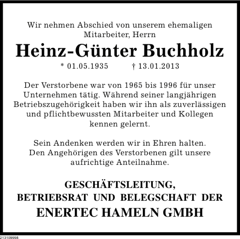 Hier finden Sie alle Traueranzeigen aus der Zeitung, die bisher für Nachruf Heinz-Günter Buchholz erschienen sind. Weitere Traueranzeigen, die in der Zeitung erscheinen, werden hier ebenfalls aufgelistet