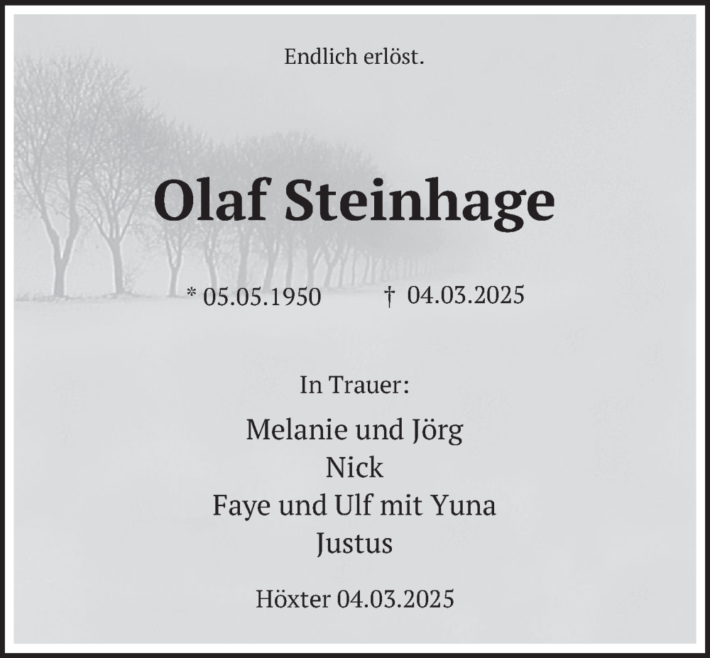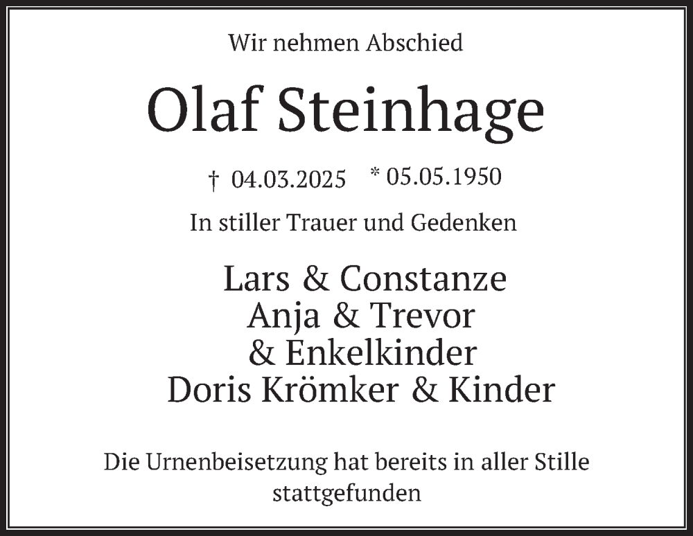 Hier finden Sie alle Traueranzeigen aus der Zeitung, die bisher für Olaf Steinhage erschienen sind. Weitere Traueranzeigen, die in der Zeitung erscheinen, werden hier ebenfalls aufgelistet