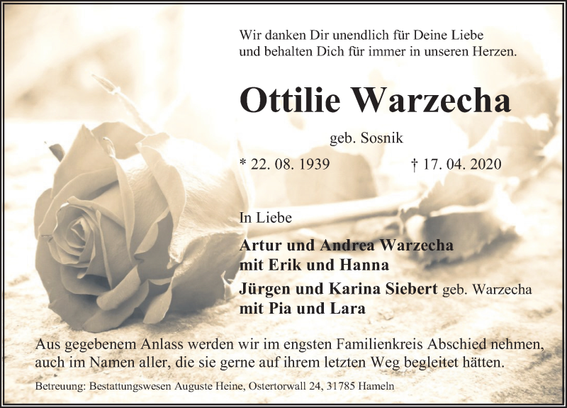 Hier finden Sie alle Traueranzeigen aus der Zeitung, die bisher für Ottilie Warzecha erschienen sind. Weitere Traueranzeigen, die in der Zeitung erscheinen, werden hier ebenfalls aufgelistet