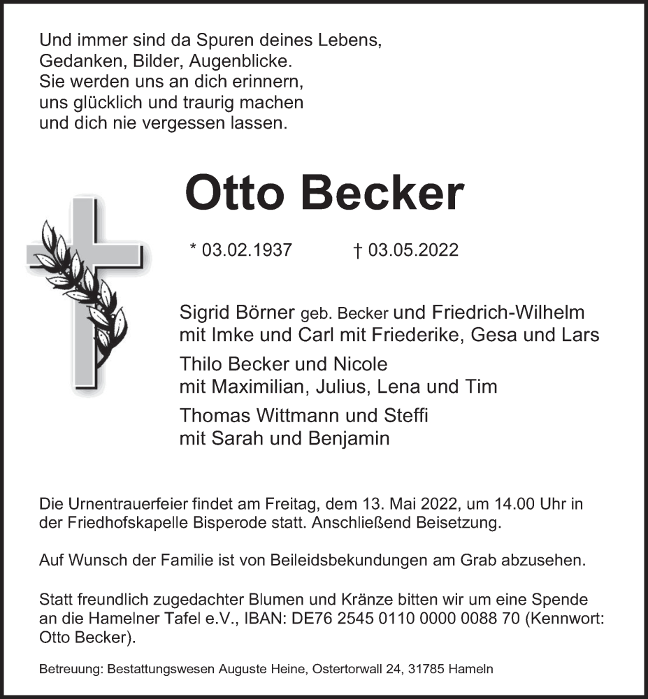 Hier finden Sie alle Traueranzeigen aus der Zeitung, die bisher für Otto Becker erschienen sind. Weitere Traueranzeigen, die in der Zeitung erscheinen, werden hier ebenfalls aufgelistet
