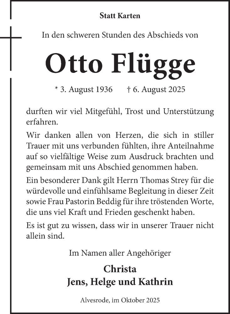 Hier finden Sie alle Traueranzeigen aus der Zeitung, die bisher für Otto Flügge erschienen sind. Weitere Traueranzeigen, die in der Zeitung erscheinen, werden hier ebenfalls aufgelistet