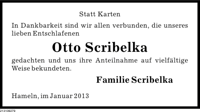 Hier finden Sie alle Traueranzeigen aus der Zeitung, die bisher für Otto Scribelka erschienen sind. Weitere Traueranzeigen, die in der Zeitung erscheinen, werden hier ebenfalls aufgelistet
