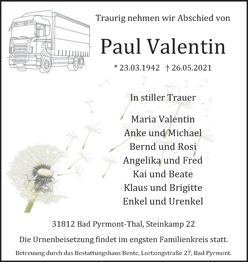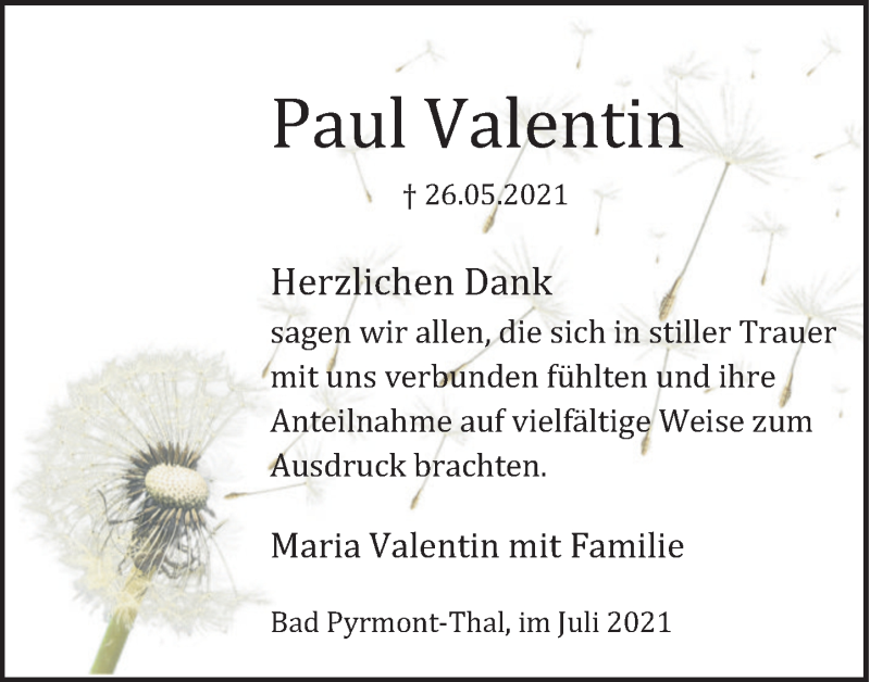 Hier finden Sie alle Traueranzeigen aus der Zeitung, die bisher für Paul Valentin erschienen sind. Weitere Traueranzeigen, die in der Zeitung erscheinen, werden hier ebenfalls aufgelistet
