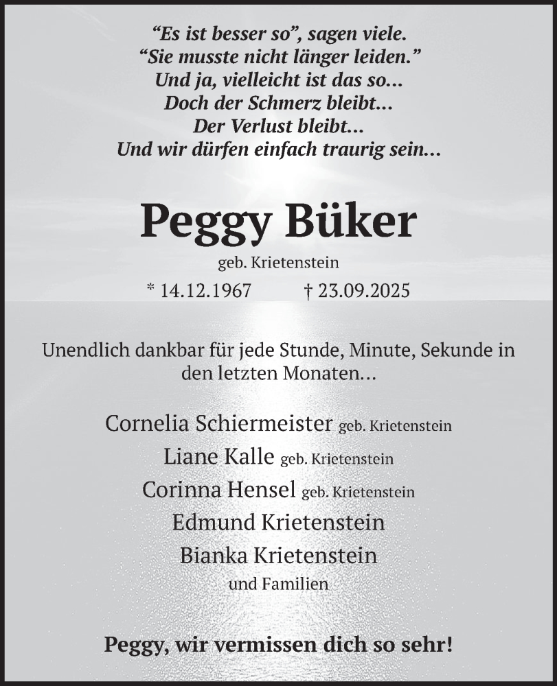 Hier finden Sie alle Traueranzeigen aus der Zeitung, die bisher für Peggy Büker erschienen sind. Weitere Traueranzeigen, die in der Zeitung erscheinen, werden hier ebenfalls aufgelistet