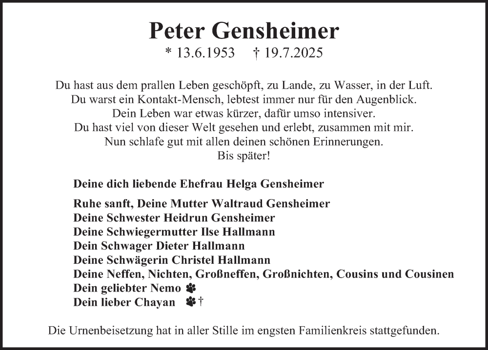 Hier finden Sie alle Traueranzeigen aus der Zeitung, die bisher für Peter Gensheimer erschienen sind. Weitere Traueranzeigen, die in der Zeitung erscheinen, werden hier ebenfalls aufgelistet