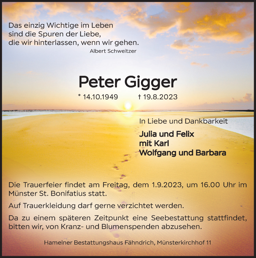 Hier finden Sie alle Traueranzeigen aus der Zeitung, die bisher für Peter Gigger erschienen sind. Weitere Traueranzeigen, die in der Zeitung erscheinen, werden hier ebenfalls aufgelistet