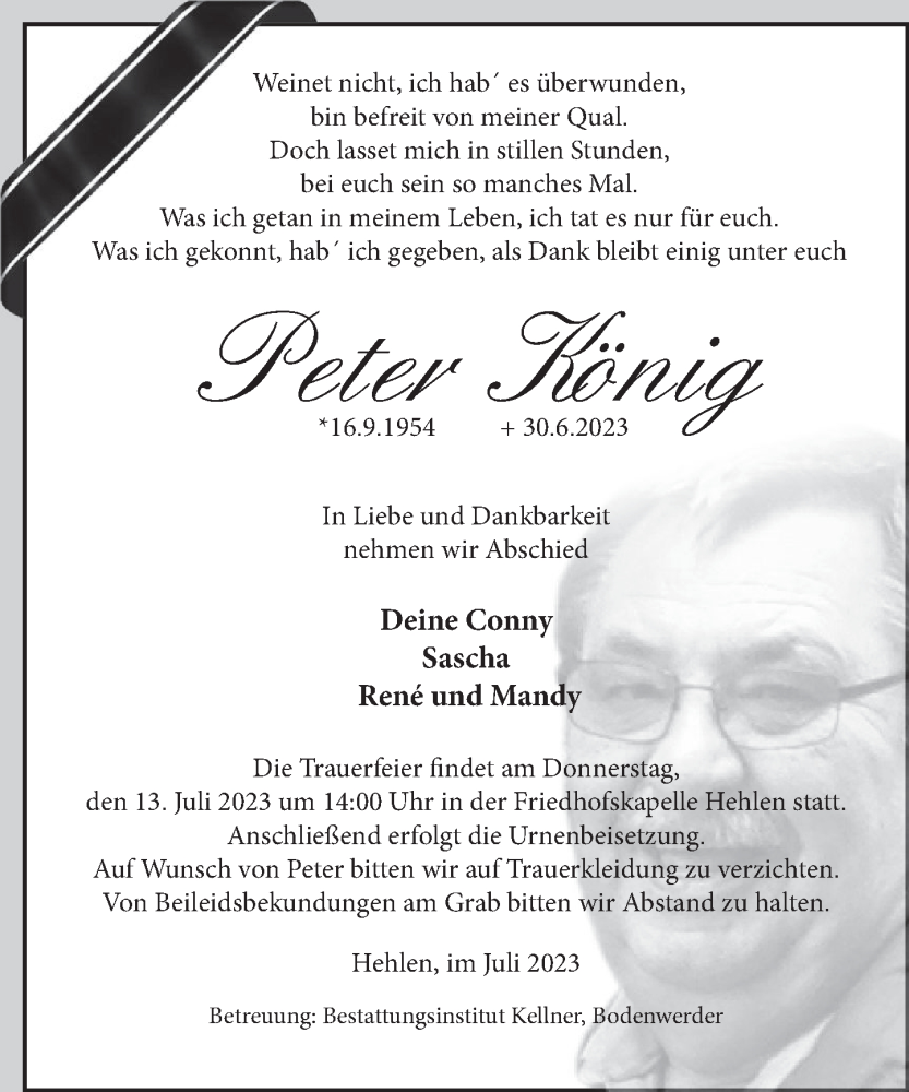 Hier finden Sie alle Traueranzeigen aus der Zeitung, die bisher für Peter König erschienen sind. Weitere Traueranzeigen, die in der Zeitung erscheinen, werden hier ebenfalls aufgelistet