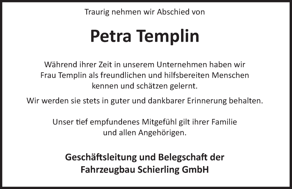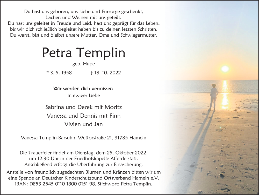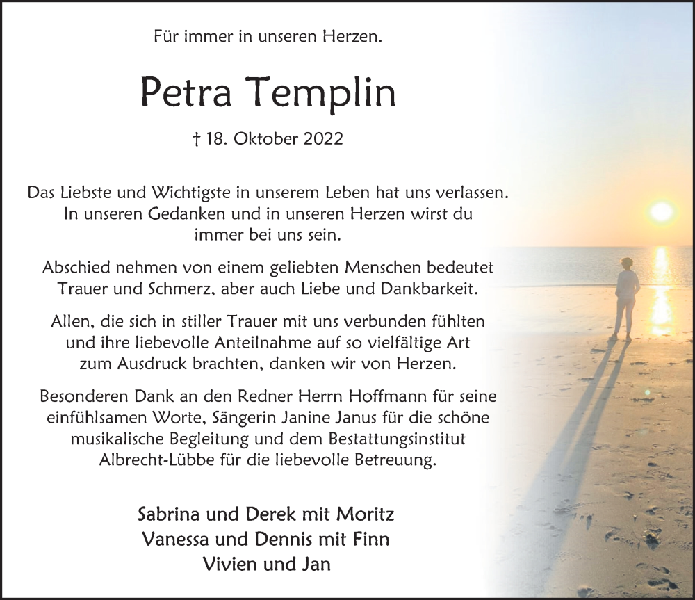 Hier finden Sie alle Traueranzeigen aus der Zeitung, die bisher für Petra Templin erschienen sind. Weitere Traueranzeigen, die in der Zeitung erscheinen, werden hier ebenfalls aufgelistet