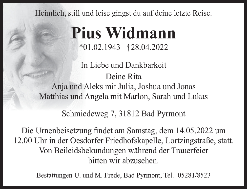Hier finden Sie alle Traueranzeigen aus der Zeitung, die bisher für Pius Widmann erschienen sind. Weitere Traueranzeigen, die in der Zeitung erscheinen, werden hier ebenfalls aufgelistet