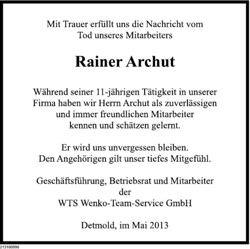 Hier finden Sie alle Traueranzeigen aus der Zeitung, die bisher für Rainer Archut erschienen sind. Weitere Traueranzeigen, die in der Zeitung erscheinen, werden hier ebenfalls aufgelistet