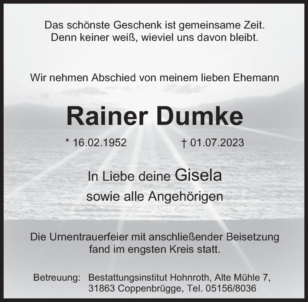 Hier finden Sie alle Traueranzeigen aus der Zeitung, die bisher für Rainer Dumke erschienen sind. Weitere Traueranzeigen, die in der Zeitung erscheinen, werden hier ebenfalls aufgelistet