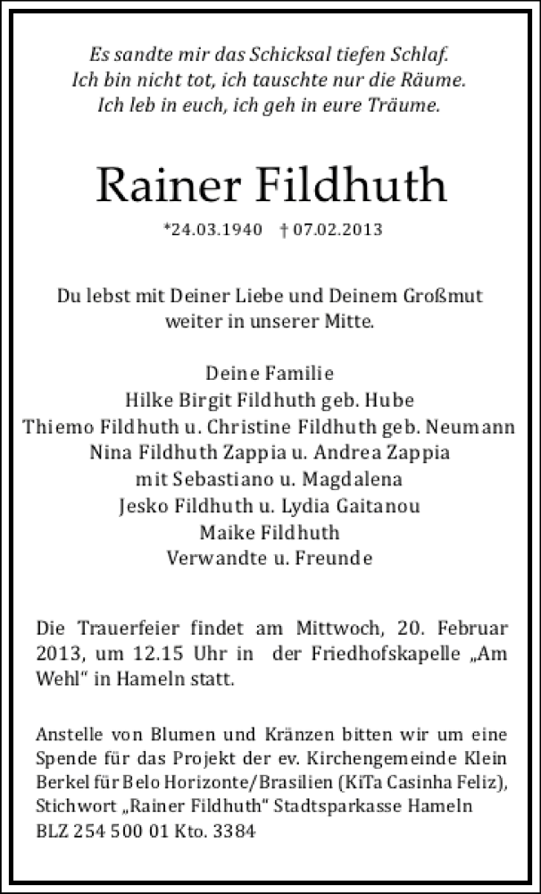Hier finden Sie alle Traueranzeigen aus der Zeitung, die bisher für Rainer Fildhuth/Trauer/Familie erschienen sind. Weitere Traueranzeigen, die in der Zeitung erscheinen, werden hier ebenfalls aufgelistet