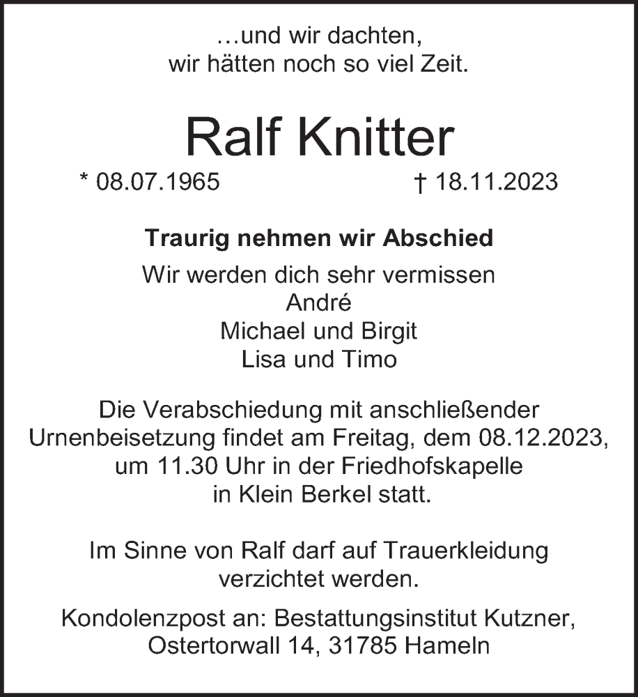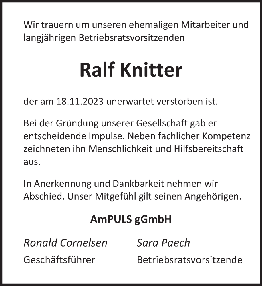 Hier finden Sie alle Traueranzeigen aus der Zeitung, die bisher für Ralf Knitter erschienen sind. Weitere Traueranzeigen, die in der Zeitung erscheinen, werden hier ebenfalls aufgelistet