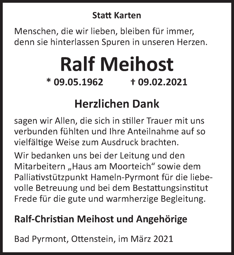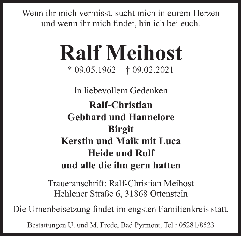 Hier finden Sie alle Traueranzeigen aus der Zeitung, die bisher für Ralf Meihost erschienen sind. Weitere Traueranzeigen, die in der Zeitung erscheinen, werden hier ebenfalls aufgelistet