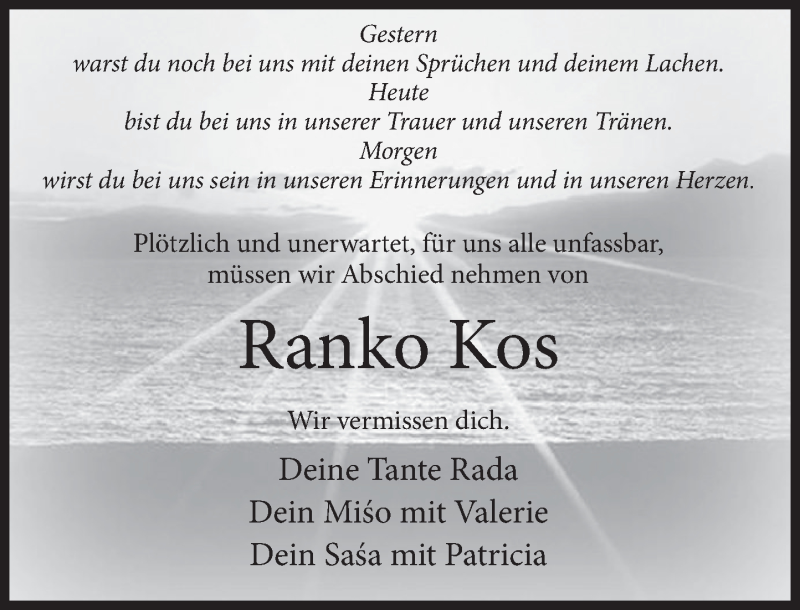 Hier finden Sie alle Traueranzeigen aus der Zeitung, die bisher für Ranko Kos erschienen sind. Weitere Traueranzeigen, die in der Zeitung erscheinen, werden hier ebenfalls aufgelistet