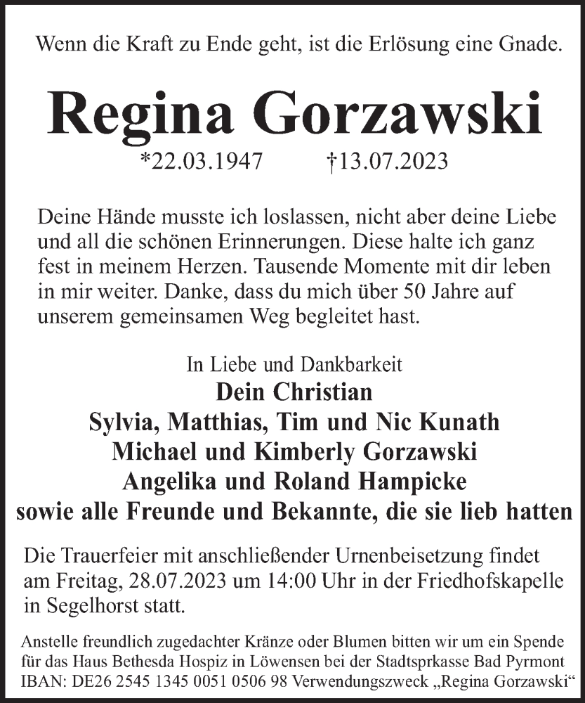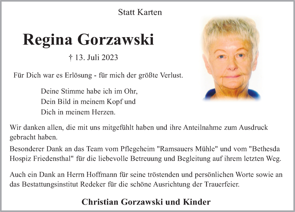 Hier finden Sie alle Traueranzeigen aus der Zeitung, die bisher für Regina Gorzawski erschienen sind. Weitere Traueranzeigen, die in der Zeitung erscheinen, werden hier ebenfalls aufgelistet