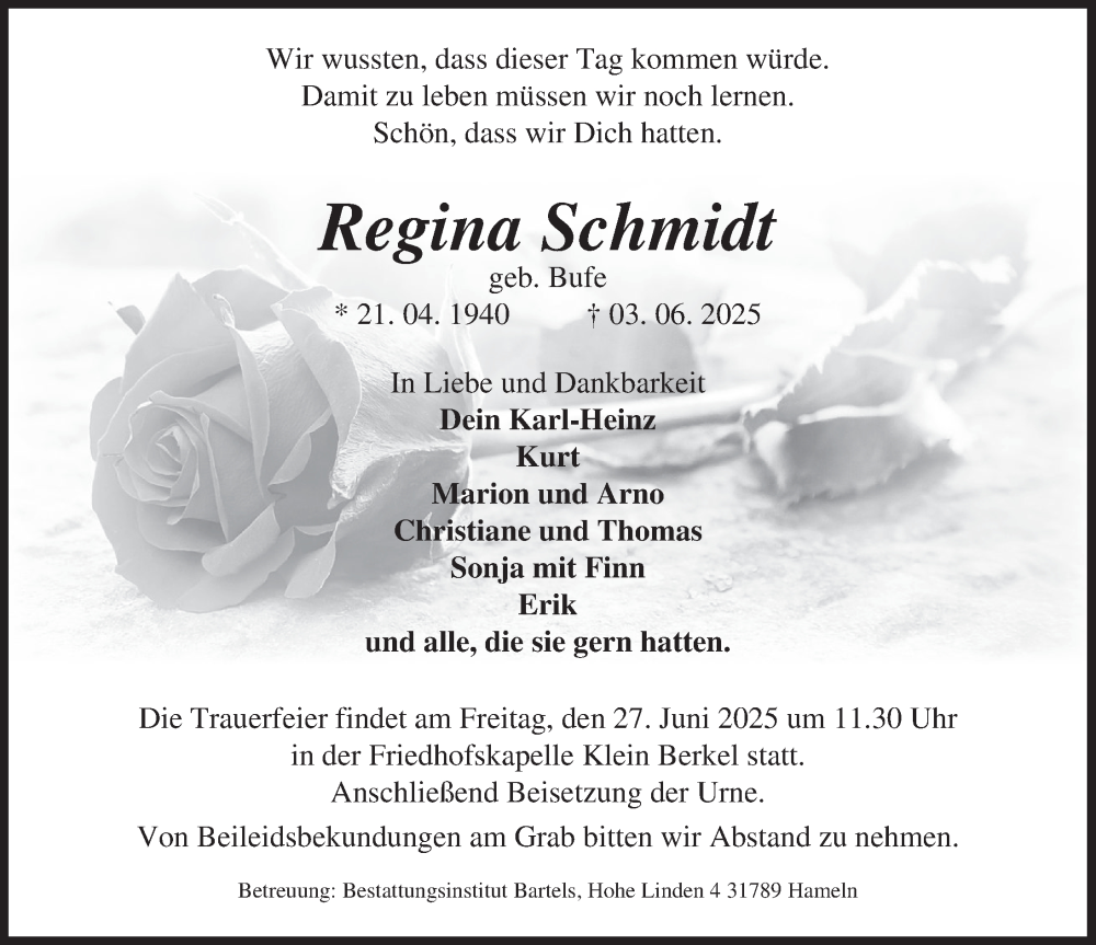 Hier finden Sie alle Traueranzeigen aus der Zeitung, die bisher für Regina Schmidt erschienen sind. Weitere Traueranzeigen, die in der Zeitung erscheinen, werden hier ebenfalls aufgelistet