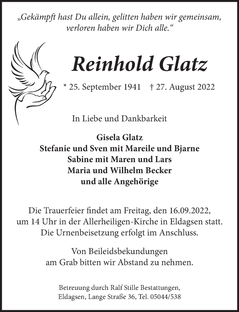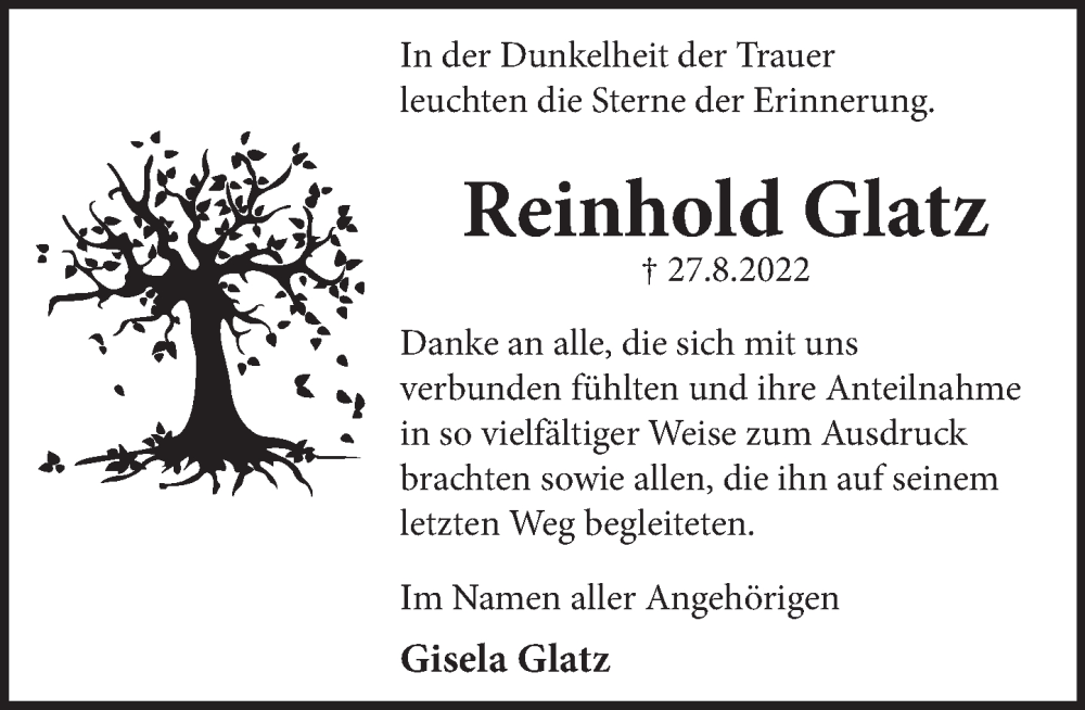 Hier finden Sie alle Traueranzeigen aus der Zeitung, die bisher für Reinhold Glatz erschienen sind. Weitere Traueranzeigen, die in der Zeitung erscheinen, werden hier ebenfalls aufgelistet