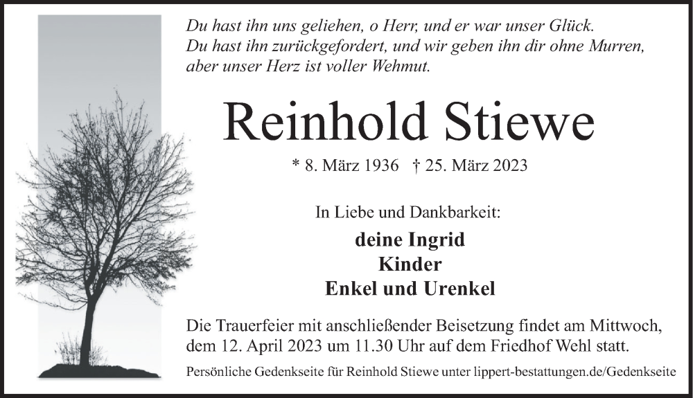 Hier finden Sie alle Traueranzeigen aus der Zeitung, die bisher für Reinhold Stiewe erschienen sind. Weitere Traueranzeigen, die in der Zeitung erscheinen, werden hier ebenfalls aufgelistet