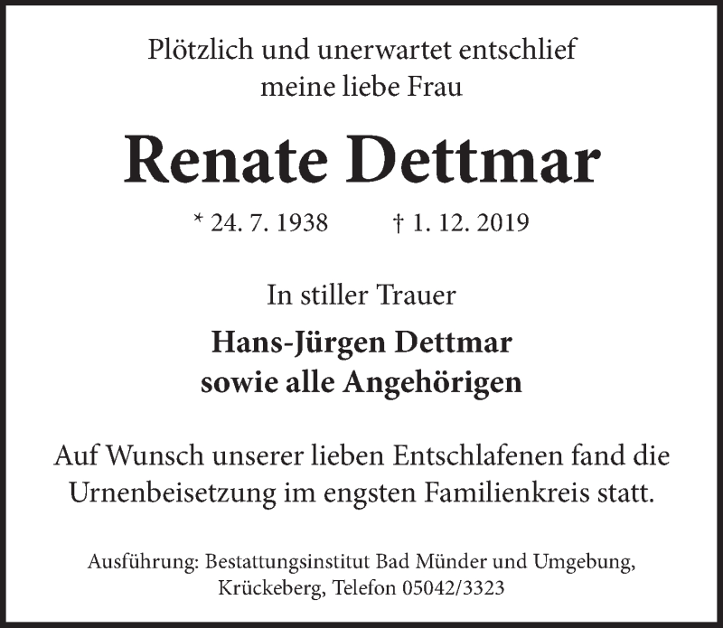 Hier finden Sie alle Traueranzeigen aus der Zeitung, die bisher für Renate Dettmar erschienen sind. Weitere Traueranzeigen, die in der Zeitung erscheinen, werden hier ebenfalls aufgelistet