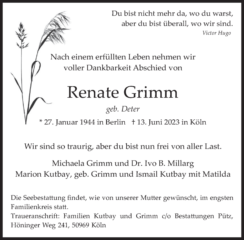 Hier finden Sie alle Traueranzeigen aus der Zeitung, die bisher für Renate Grimm erschienen sind. Weitere Traueranzeigen, die in der Zeitung erscheinen, werden hier ebenfalls aufgelistet