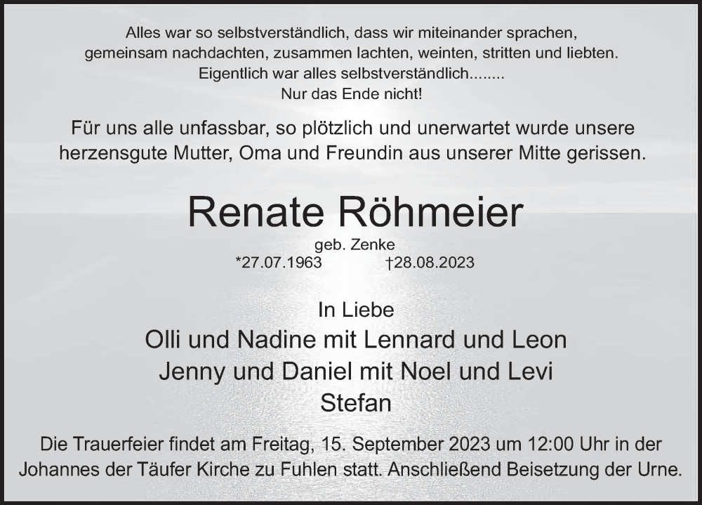 Hier finden Sie alle Traueranzeigen aus der Zeitung, die bisher für Renate Röhmeier erschienen sind. Weitere Traueranzeigen, die in der Zeitung erscheinen, werden hier ebenfalls aufgelistet