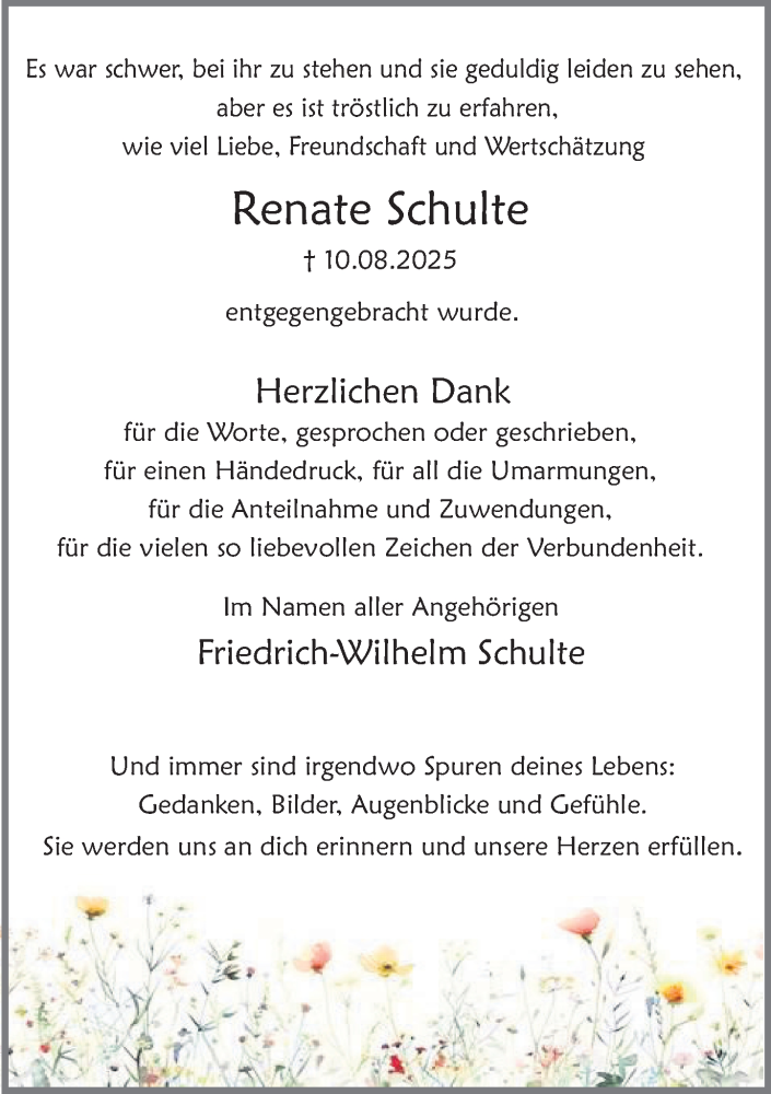 Hier finden Sie alle Traueranzeigen aus der Zeitung, die bisher für Renate Schulte erschienen sind. Weitere Traueranzeigen, die in der Zeitung erscheinen, werden hier ebenfalls aufgelistet