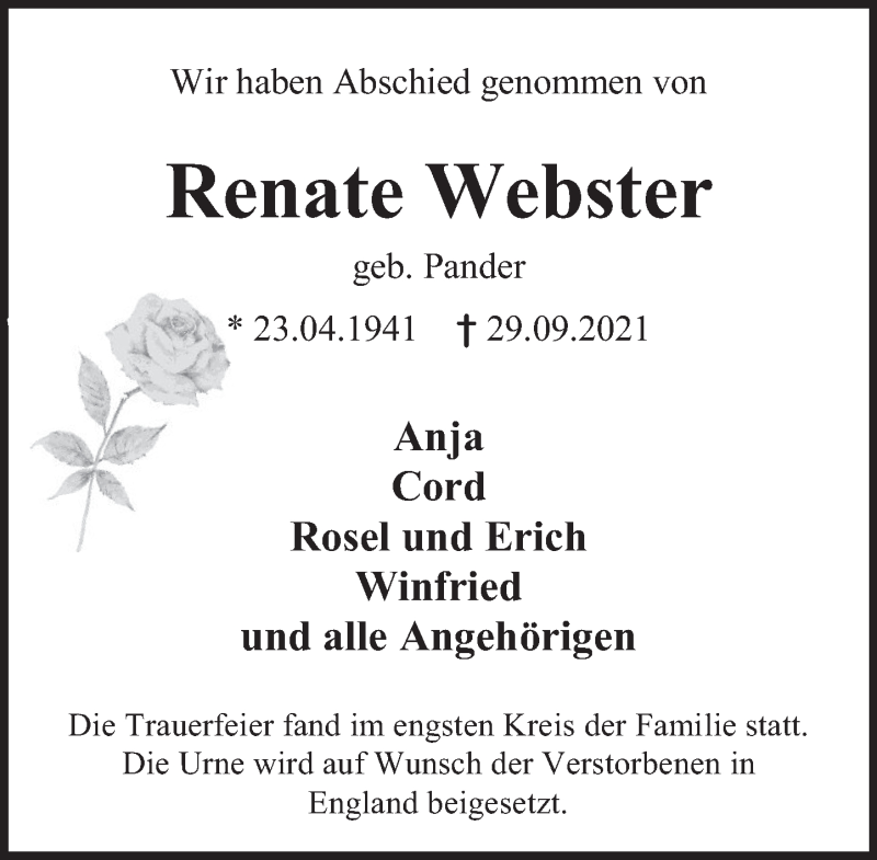 Hier finden Sie alle Traueranzeigen aus der Zeitung, die bisher für Renate Webster erschienen sind. Weitere Traueranzeigen, die in der Zeitung erscheinen, werden hier ebenfalls aufgelistet
